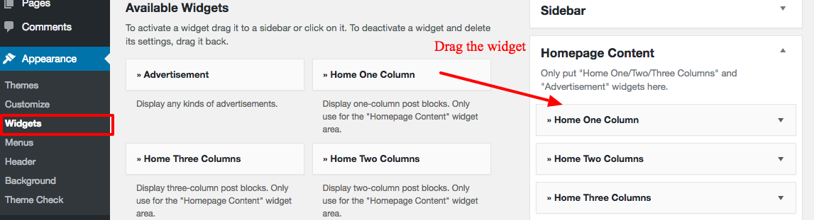 Put the "Home 2 Columns", "Home Carousel" and "Home Top Section" widgets to the Homepage widget area.