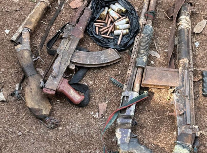 Seven weapons were recovered from the scene, including two pump-action guns loaded with ammunition, an unbranded pistol, twenty-five live cartridges, and six spent cartridges.
